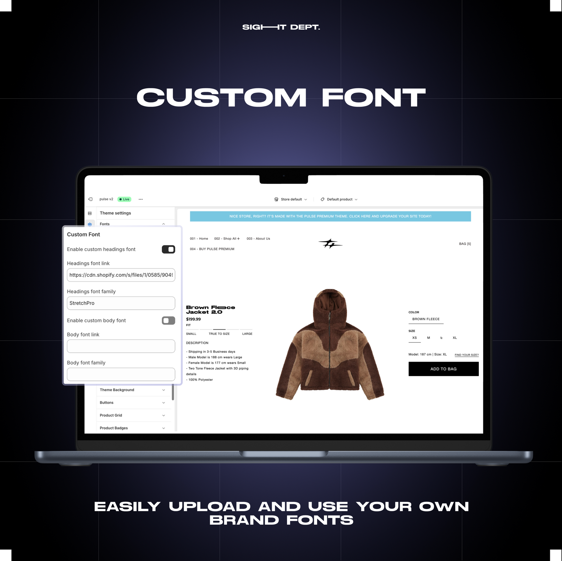 Pulse© lets you flex with custom fonts. Upload any font from DaFont or 1001Fonts etc. to make your site pop. Our guide has you covered with a simple, step-by-step walkthrough to get it done with ease.