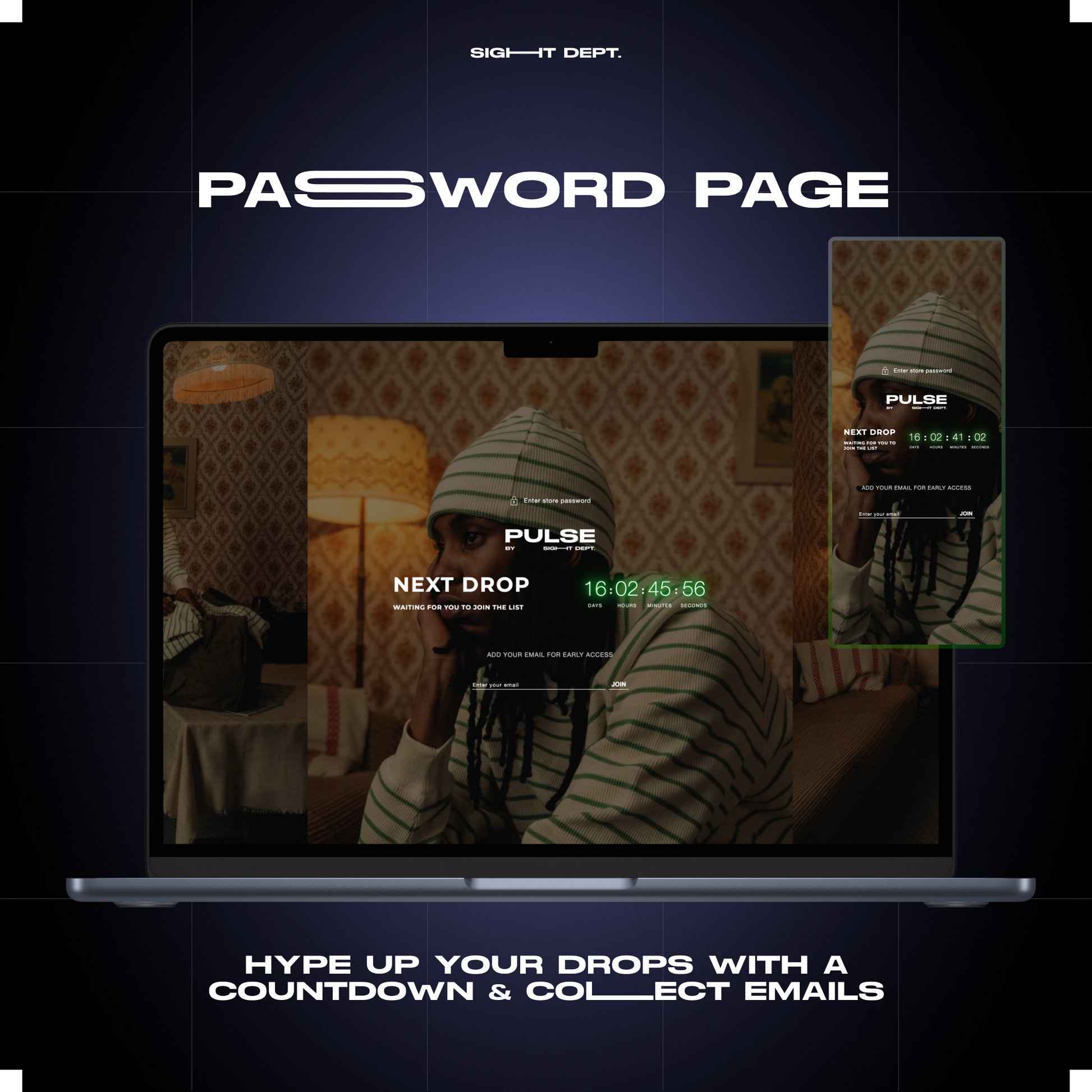 Build hype before your launch with our password page. Use it to collect emails or phone numbers, and the built-in countdown timer creates urgency for your drops
