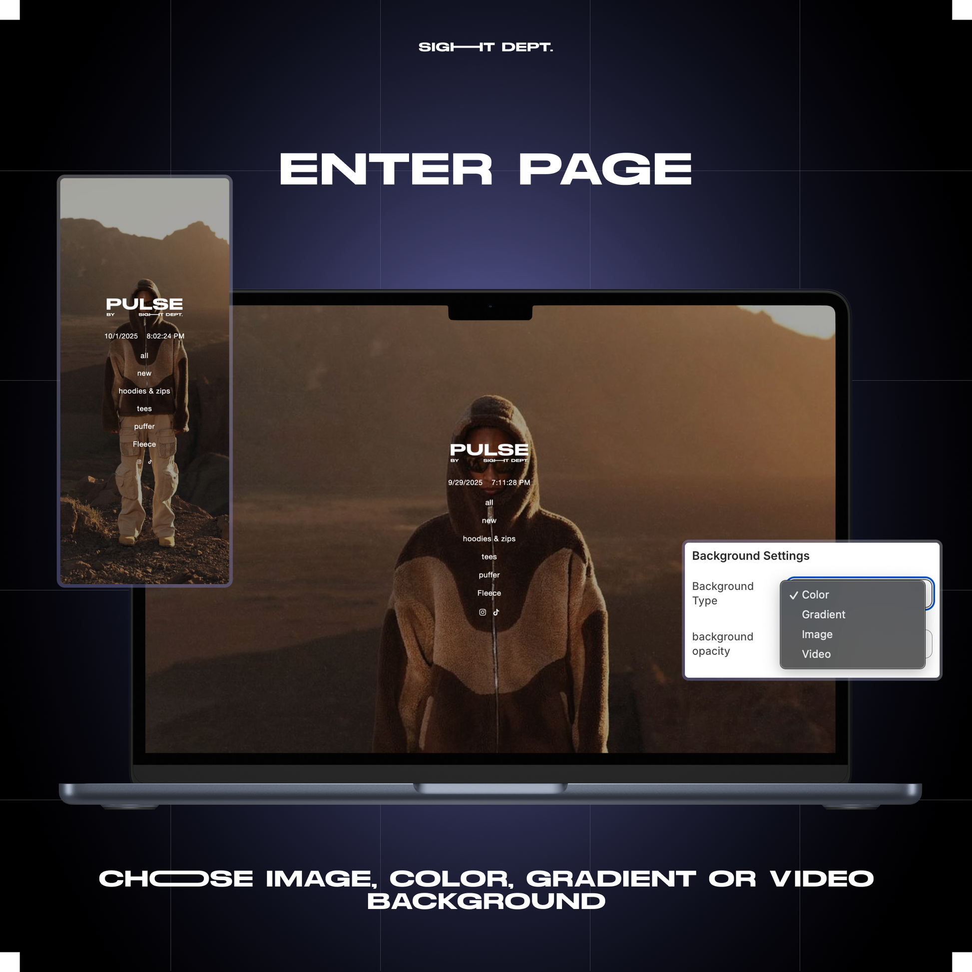 Pulse© entry page is designed to make your site stand out, letting you showcase your brand's style with minimalistic or bold customizations (OPTIONAL)